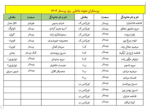 اسامی پرستاران نمونه کشوری، استانی و بیمارستانی مرکز آنکولوژی امیر به شرح زیر است: